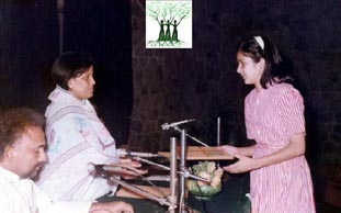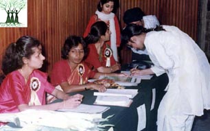 The Union Deputy Minister in charge of Women and Child Development, Government of India, Hon'ble Smt. Usha Sinha, felicitating the girl student delegate in the presence of Prof. Priya Ranjan Trivedi, Patron, WAGE at India International Centre, New Delhi on the occasion of the inauguration of "Women's Agency for Generating Employment (WAGE)".